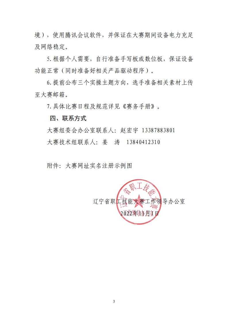 依据《关于举办2022辽宁省职工技能大赛暨全省动画绘制员技能大赛的通知》 ( 辽职赛办发〔 2022〕 38号) 安排,受疫情因素影响, 原定于9月中旬举办的2022辽宁省职工技能大赛暨全省动画绘制员大赛( 以下简称“大赛” ) 更改为11月5日线上举办, 现将大赛有关事项通知如下: